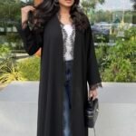 - Crepe abaya with lace details in a purple color and a flared cut