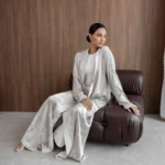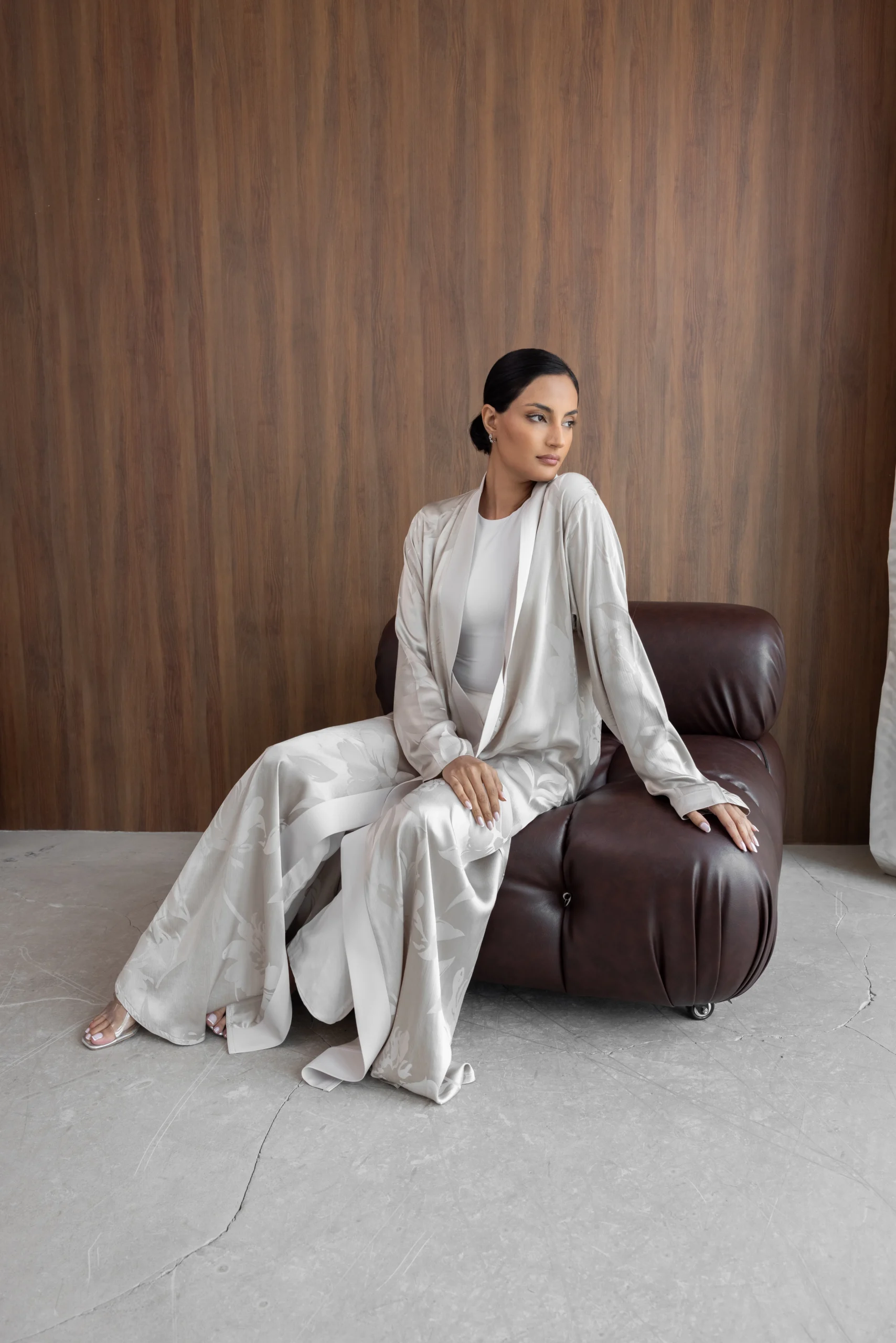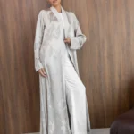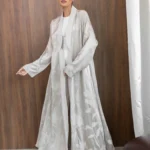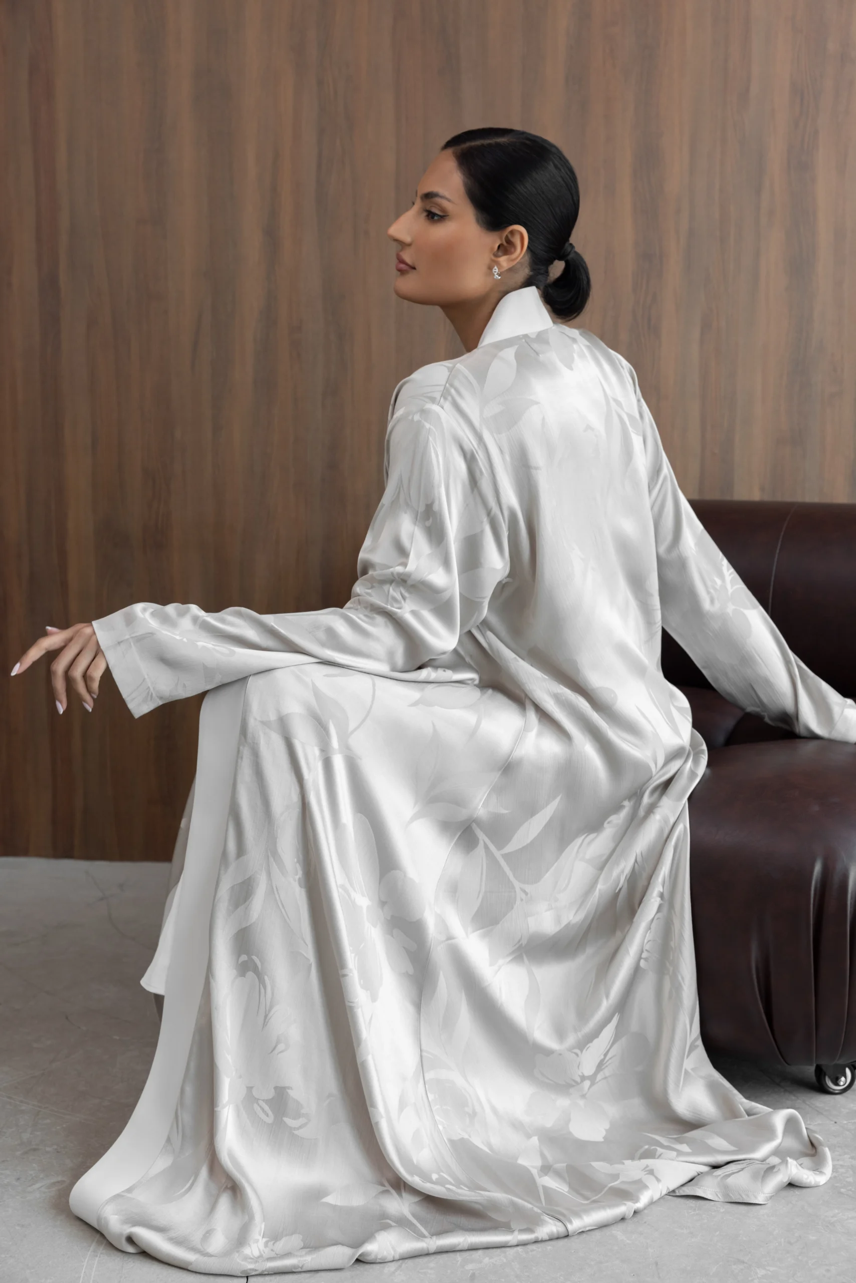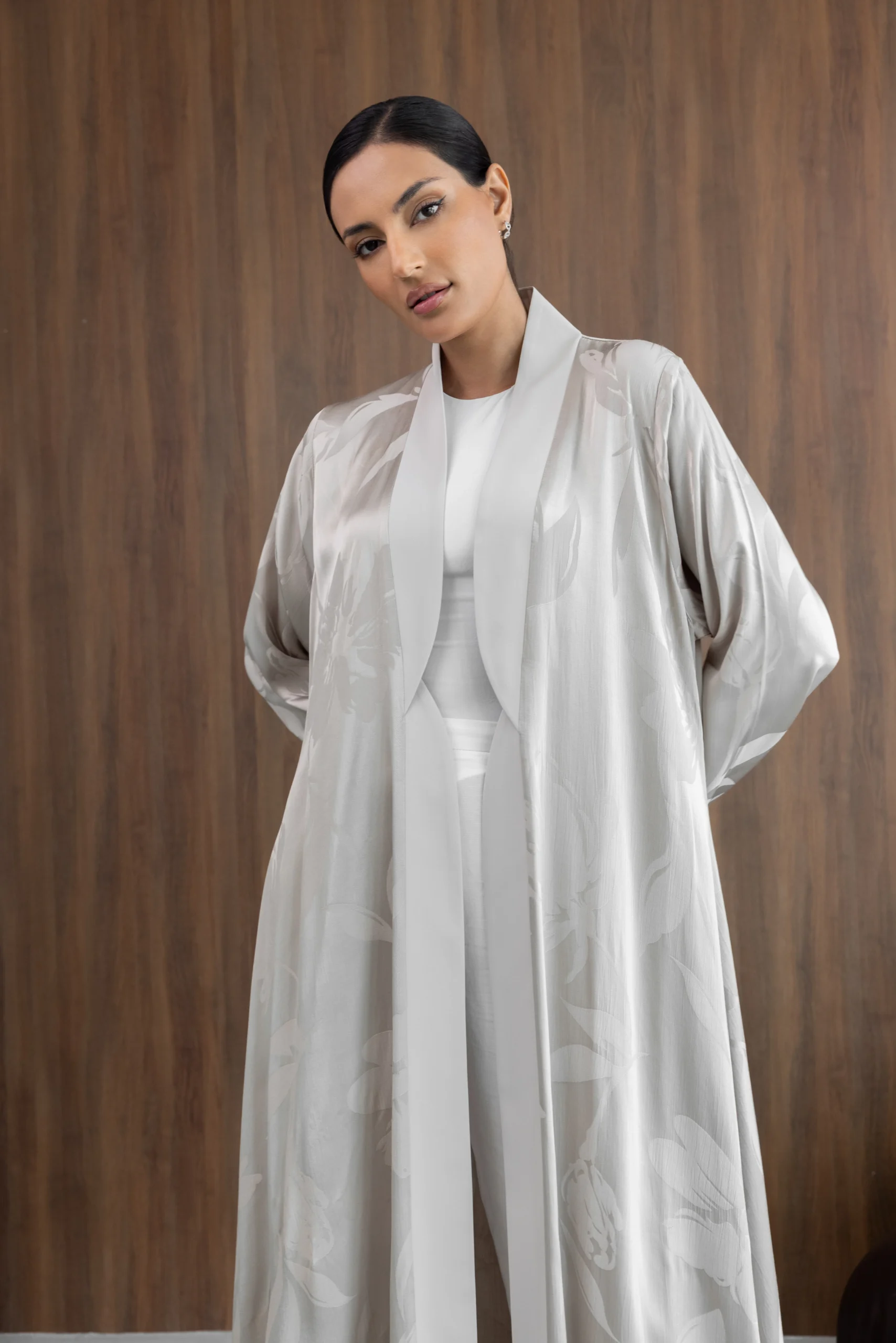 Turkish patterned silk jacquard abaya in a flared cut in pearl