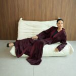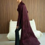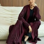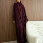 Turkish patterned silk flared abaya in a flared cut in burgundy