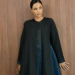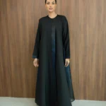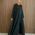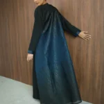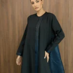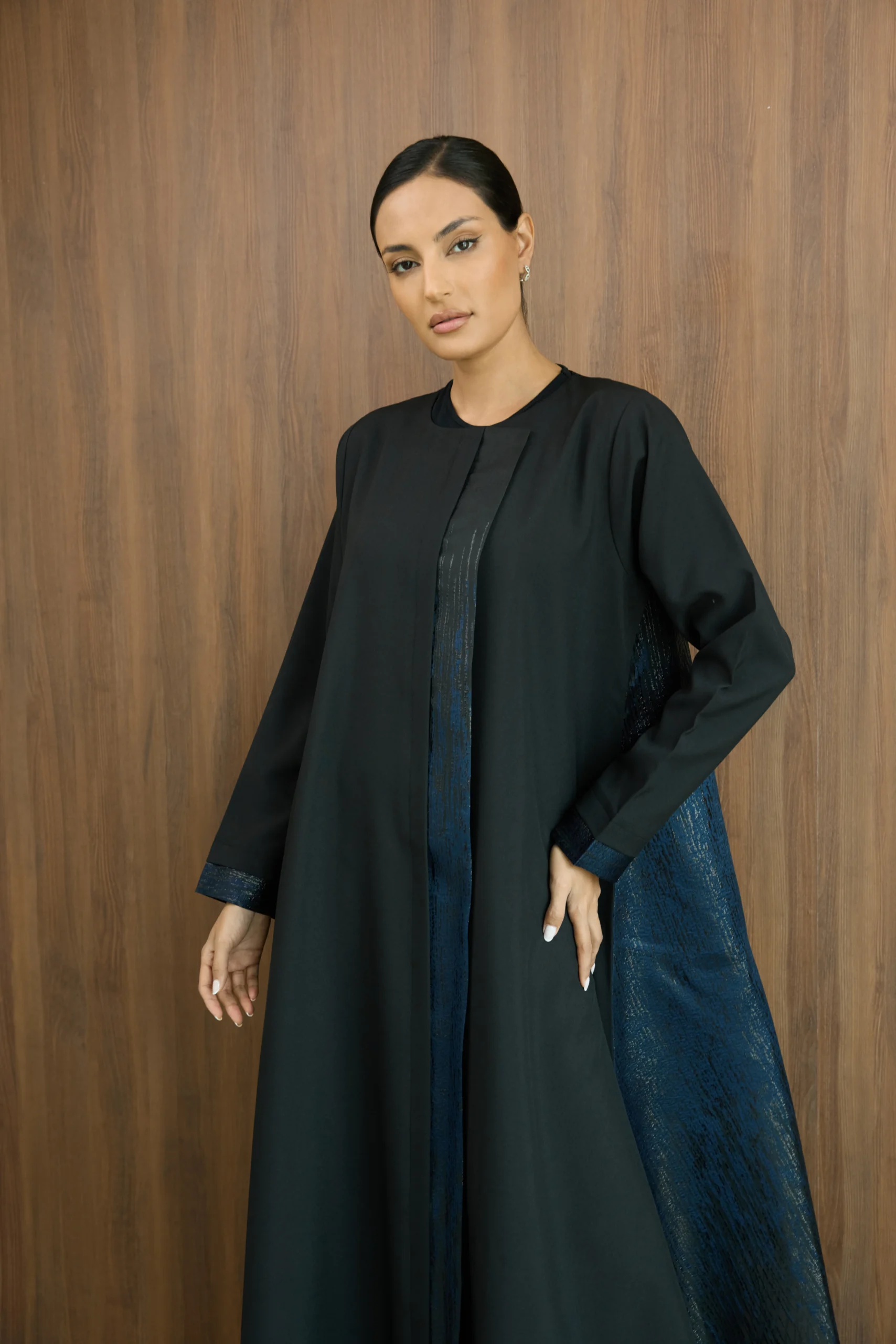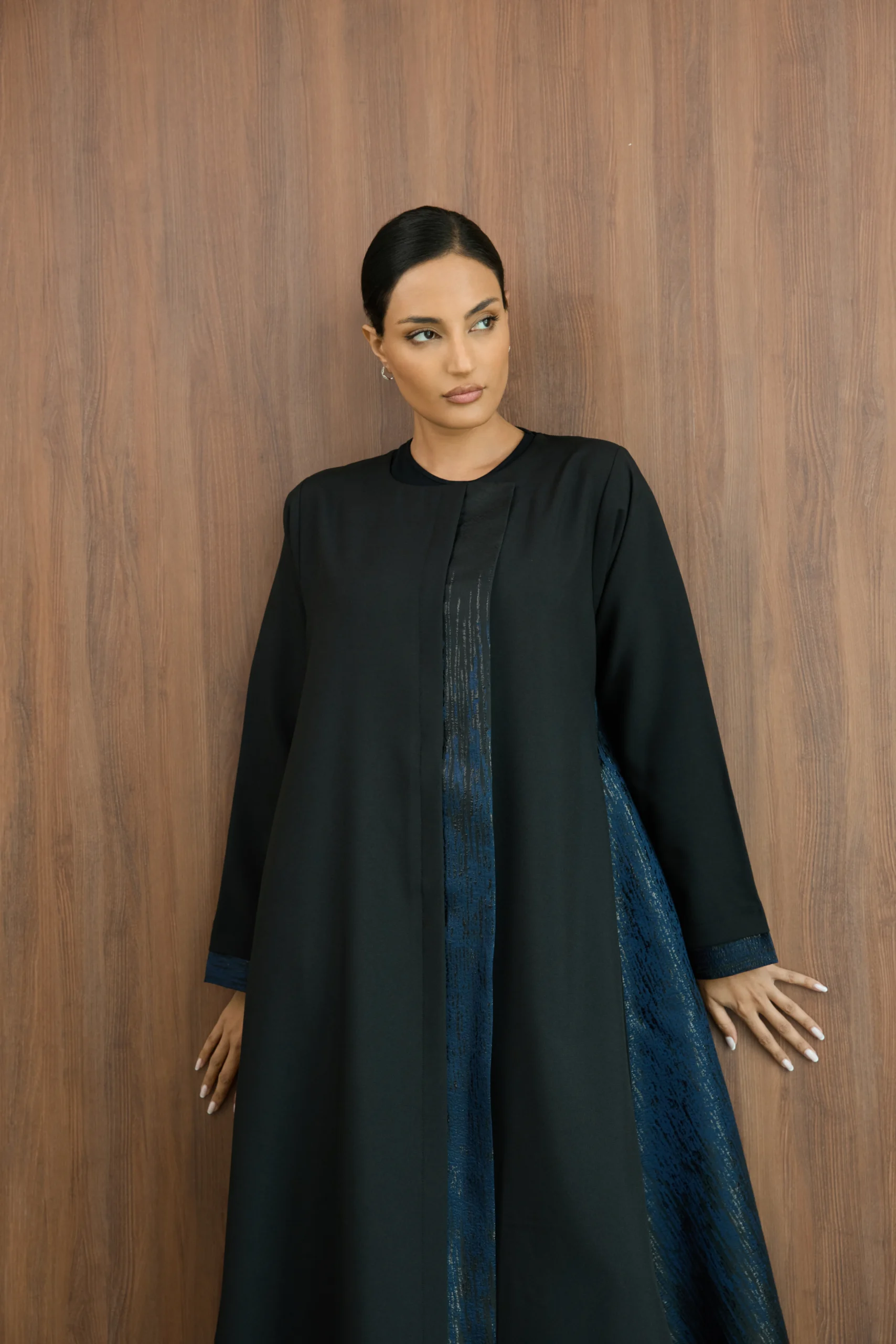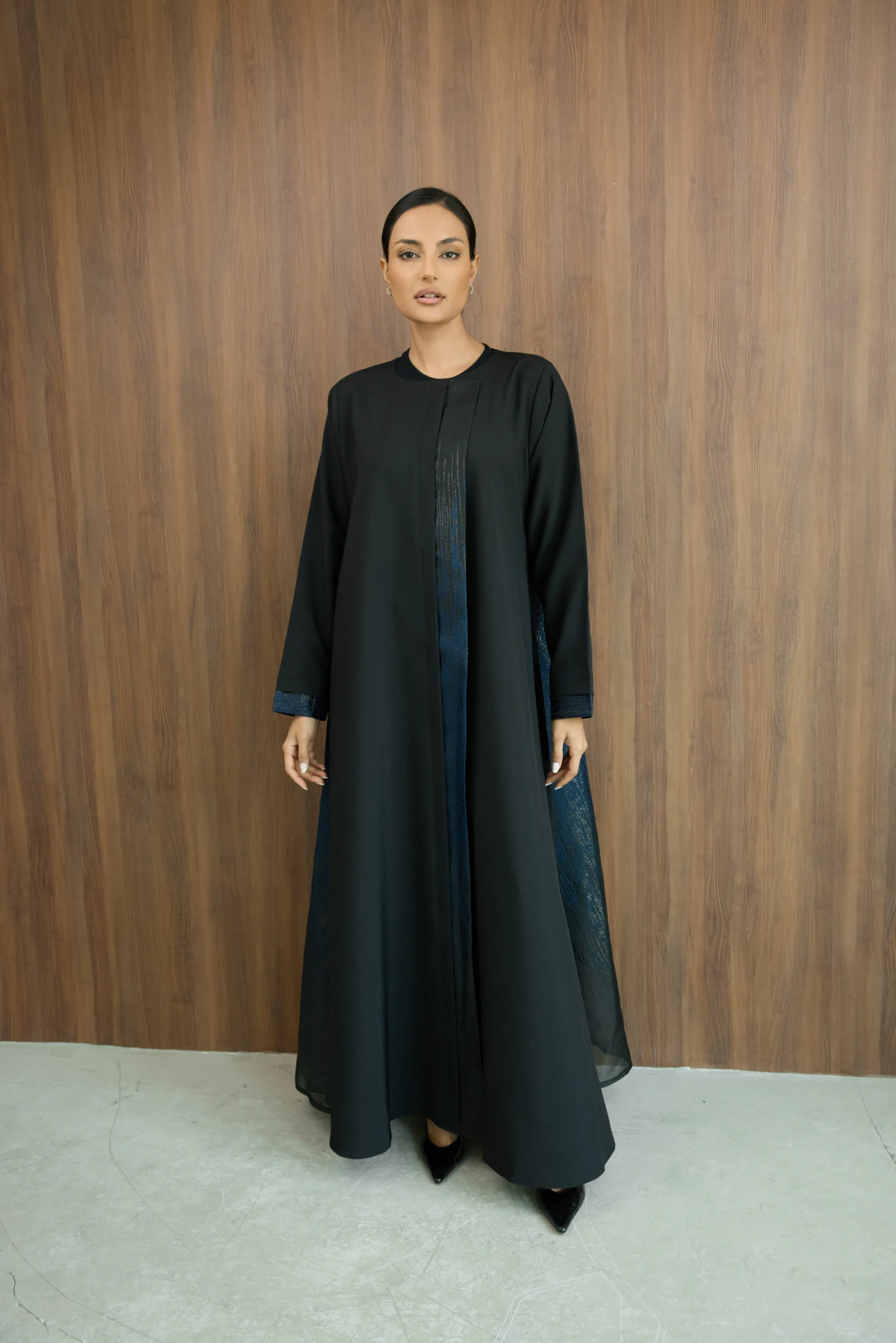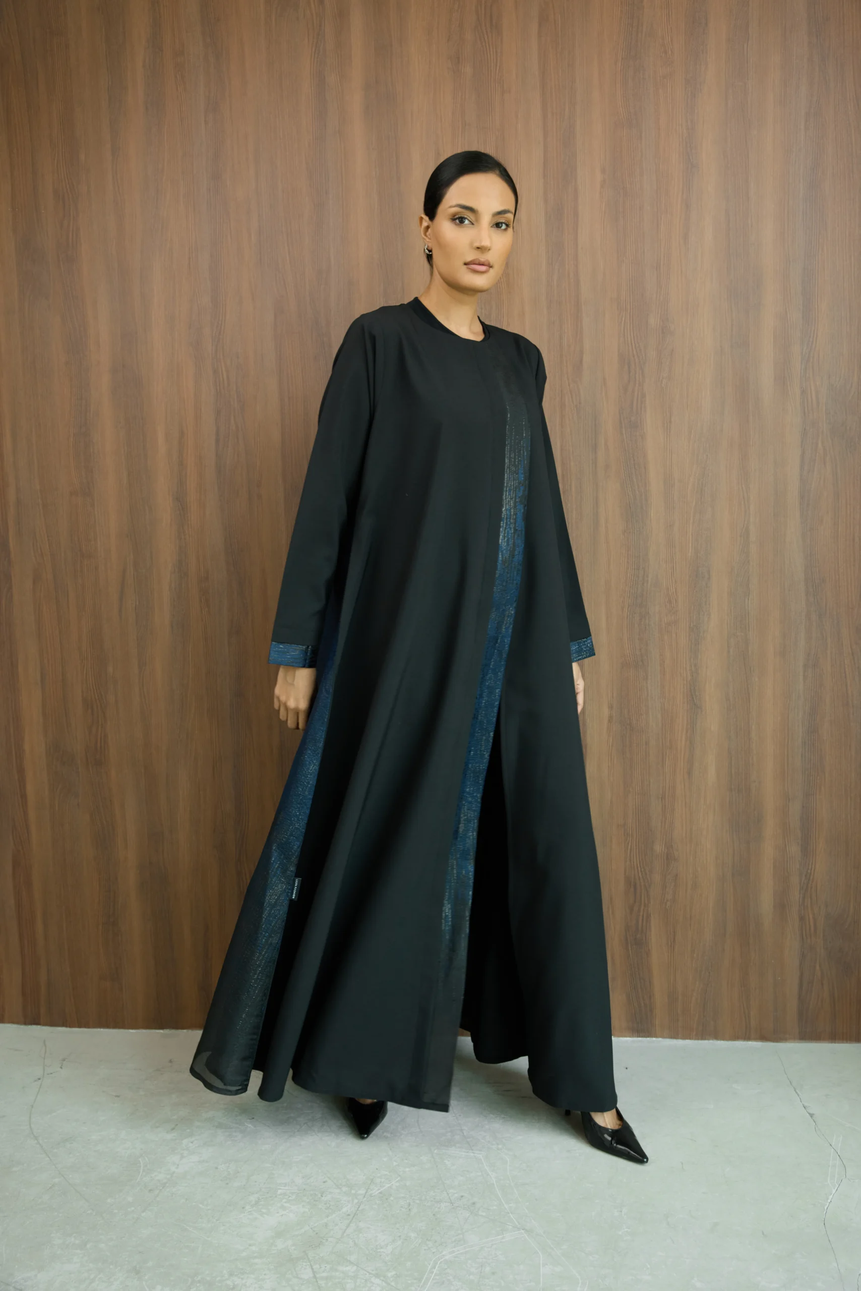 Flared abaya with crepe fabric at the front and organza at the back in navy blue