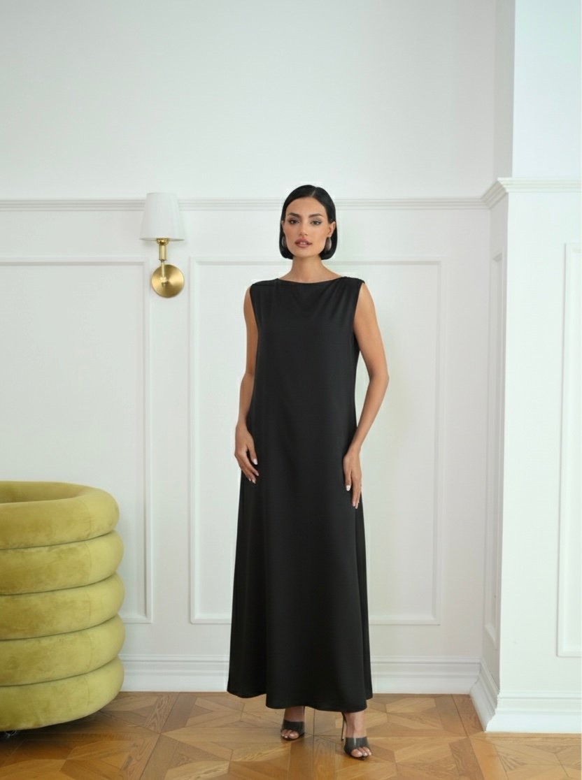 A-line dress in black color , featuring a boat neck for an elegant and refined look.