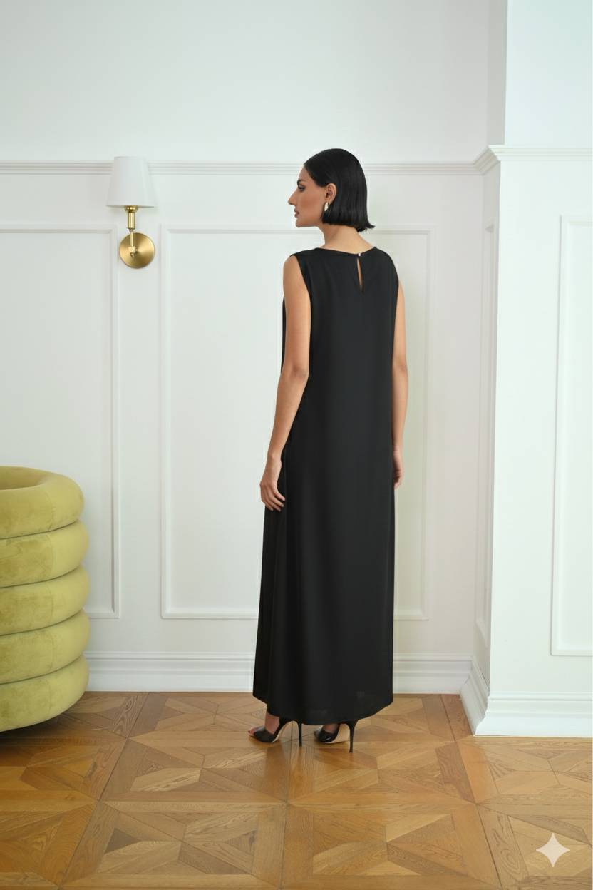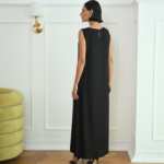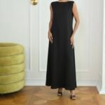 A line dress in off white color , lined for a smooth finish, featuring a boat neck for an elegant and refined look